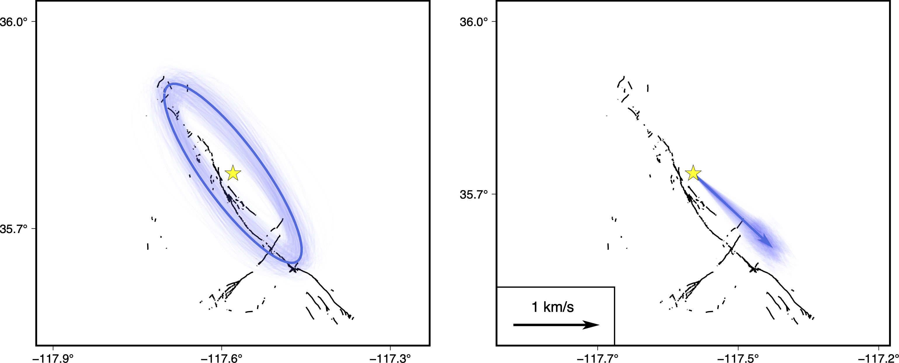 Ensemble of map projections of second moment source estimates of spatial extent (left) and directivity (right) for the 2019 M7.1 Ridgecrest earthquake.