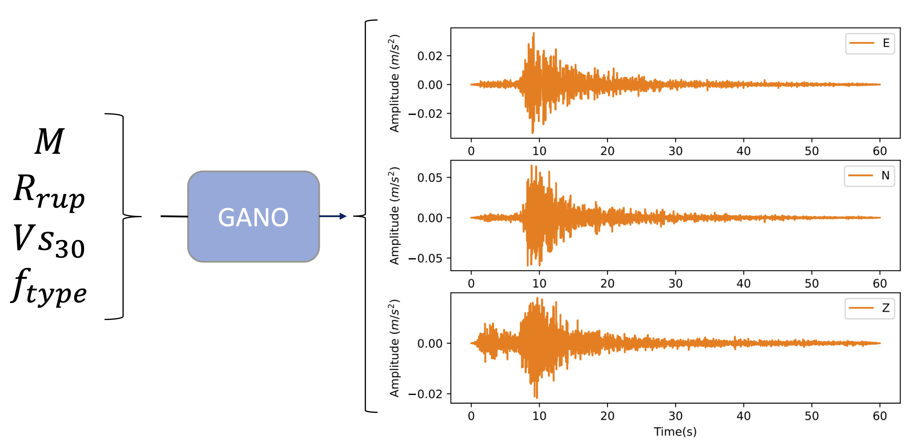 A cartoon summary of our deep generative framework for seismic accelerogram synthesis. A neural operator model (GANO) learns to generate complete three-component earthquake ground motions conditional on a set of input engineering quantities (magnitude, distance, Vs30, faulting type).