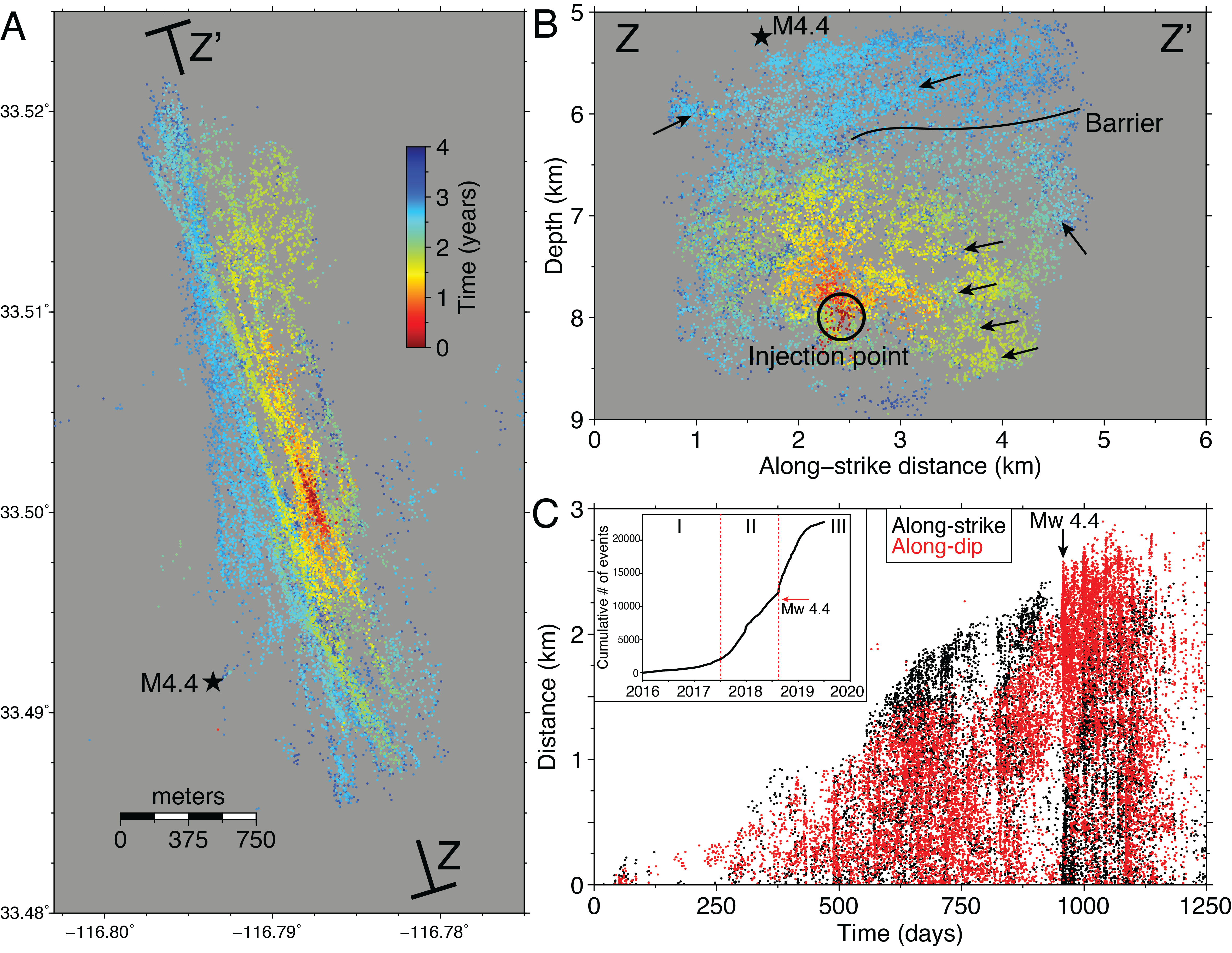 Summary of spatial and temporal behavior of the seismicity during the 2016-2020 Cahuilla swarm.