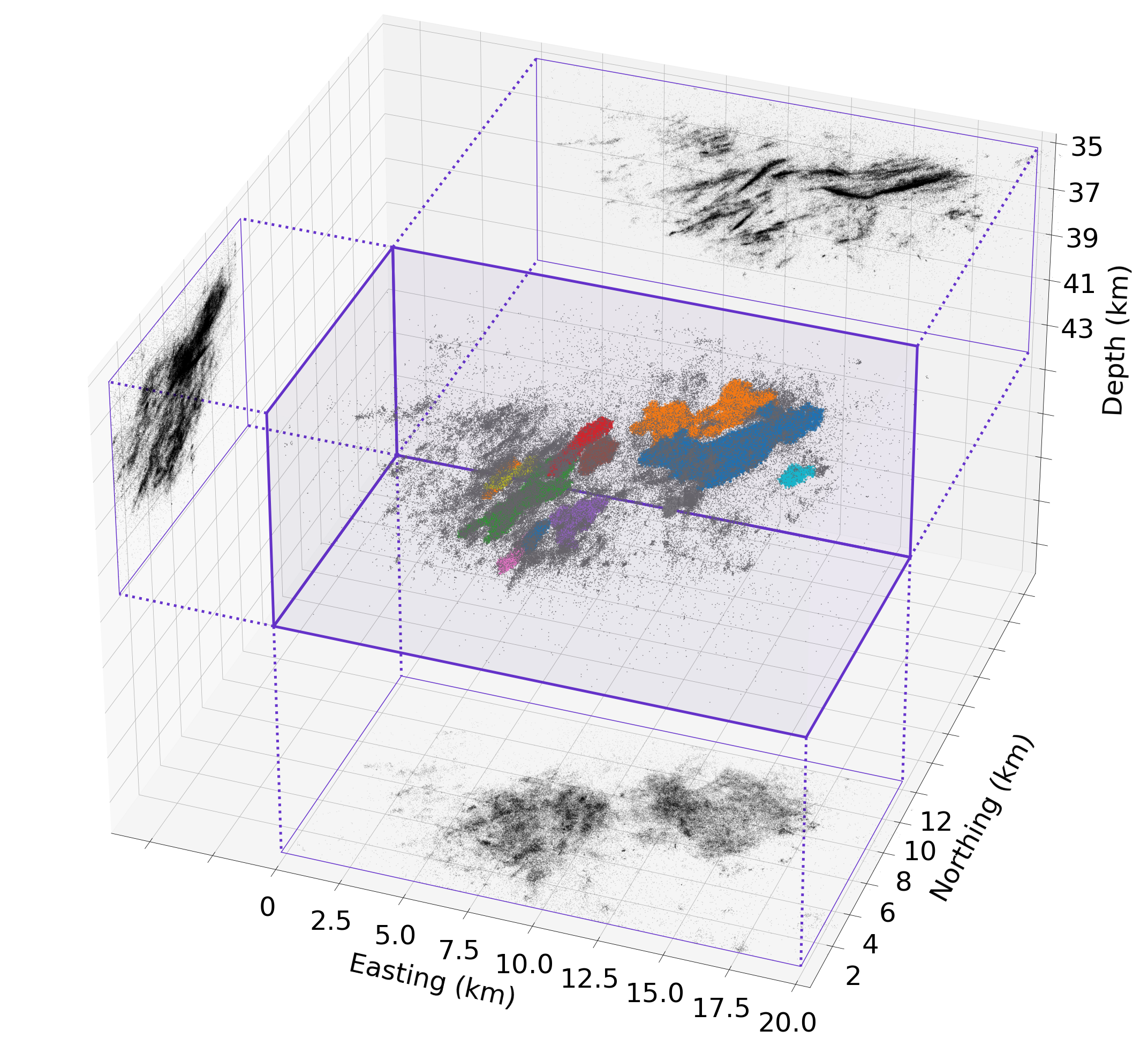 Isometric view of seismicity in the Pāhala Sill Complex, a magma transport structure in the Hawaiian mantle. Individual sills are colored for clarity. Earthquakes are also shown projected into depth sections and map view.